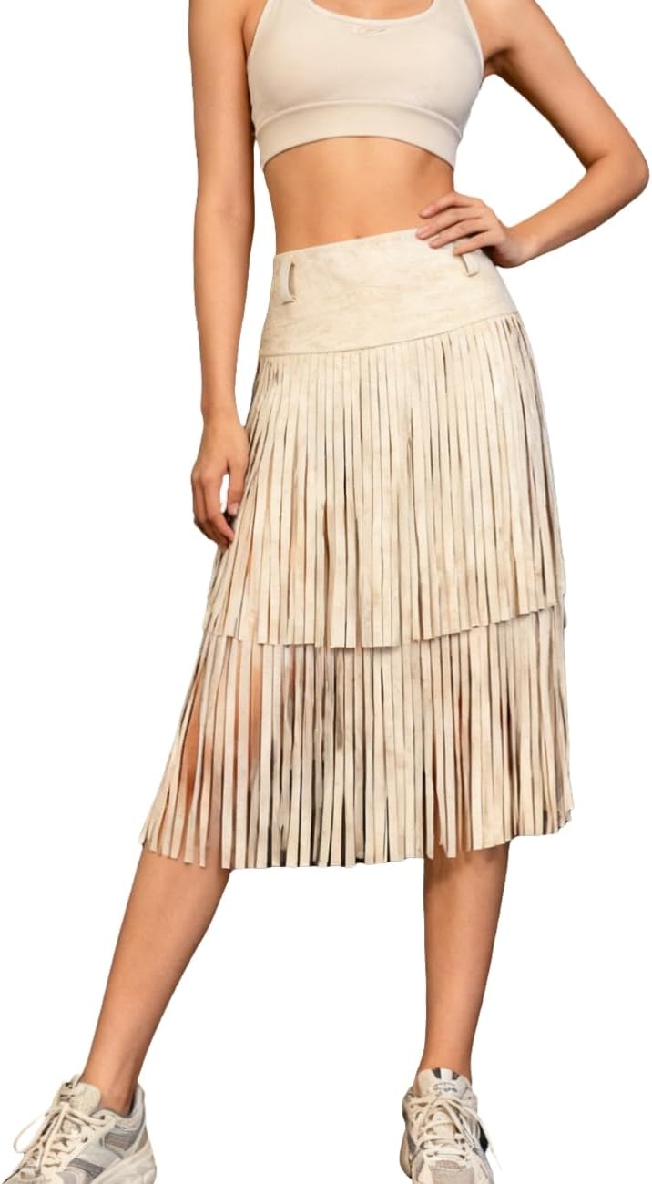 Apocrypha Womens Boho Fringe Faux Suede Trendy Casual Tassel Country Concert Western Cowgirl Skirt