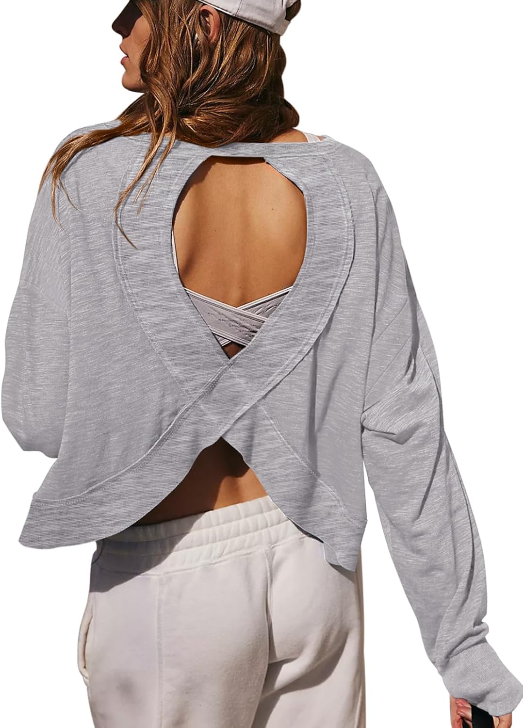 LASLULU Womens Open Back Long Sleeve Workout Tops Athletic Shirts Boat Neck Casual Running Tee Y2k Yoga Gym Tops