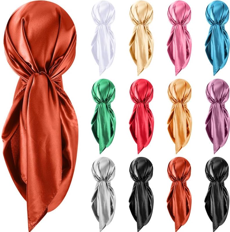 Hicarer 12 Pcs 35 Inch Satin Head Scarf Square Silk Like Neck Scarf Large Hair Scarf Silk Lightweight Hair Wrapping for Women