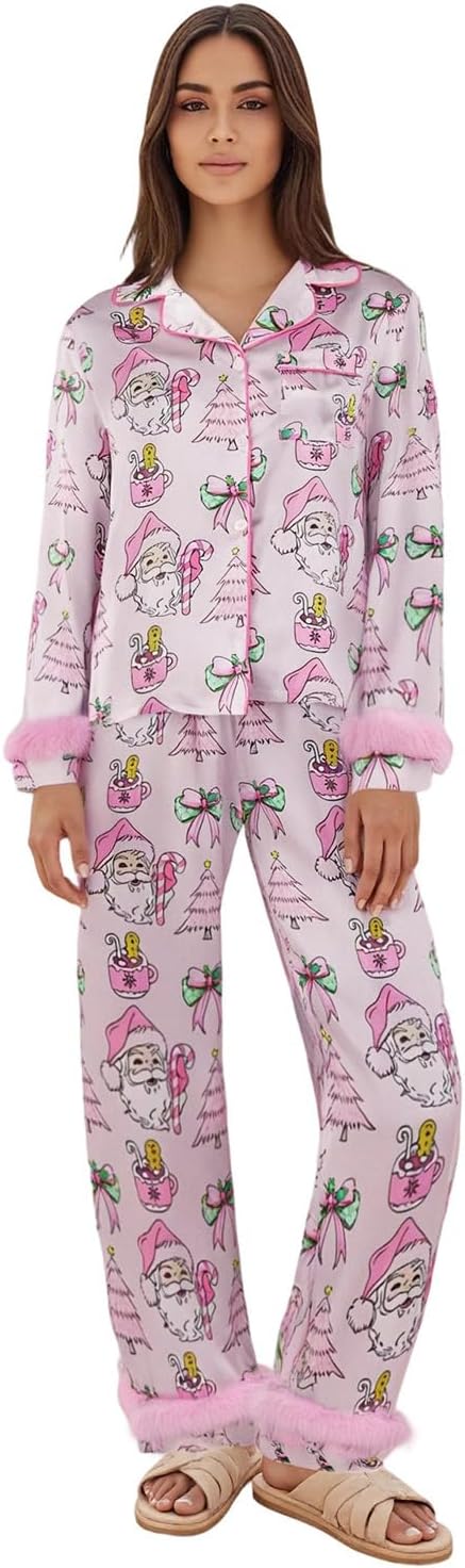 Women 2 Piece Christmas Pajamas Santa/Christmas Tree/Boots Print Shirts Tops and Pants Loungewear Outfits