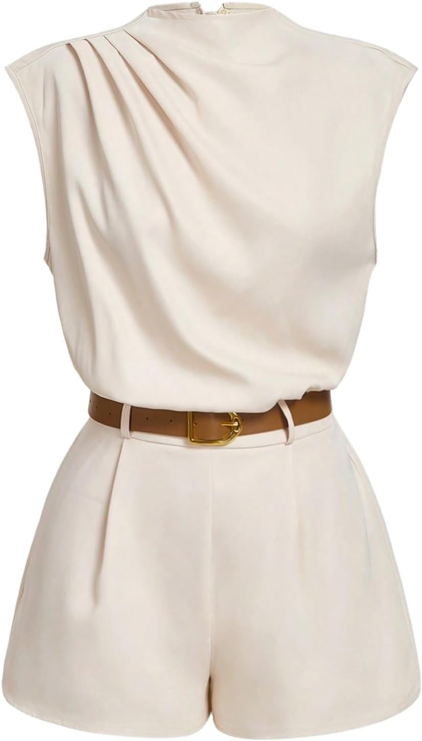 SOLY HUX Women's Summer Ruched Mock Neck Romper Elegant Cap Sleeve Belted Work Short Jumpsuits