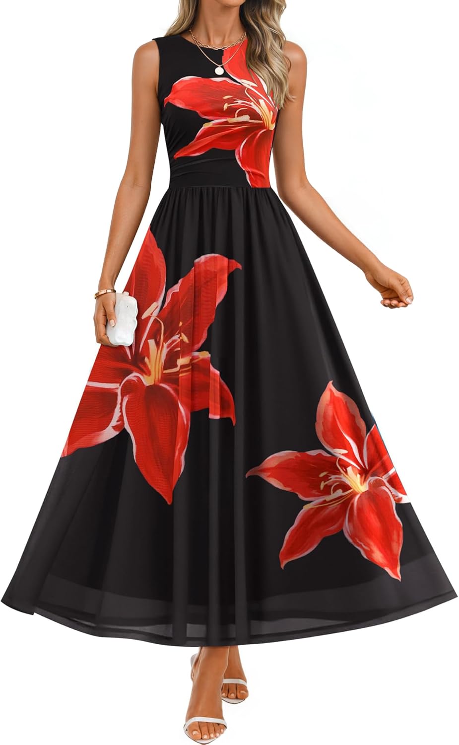 ZESICA Women's Summer Sleeveless Floral Maxi Dress 2026 Casual Crewneck Mesh A Line Flowy Boho Beach Party Long Dresses