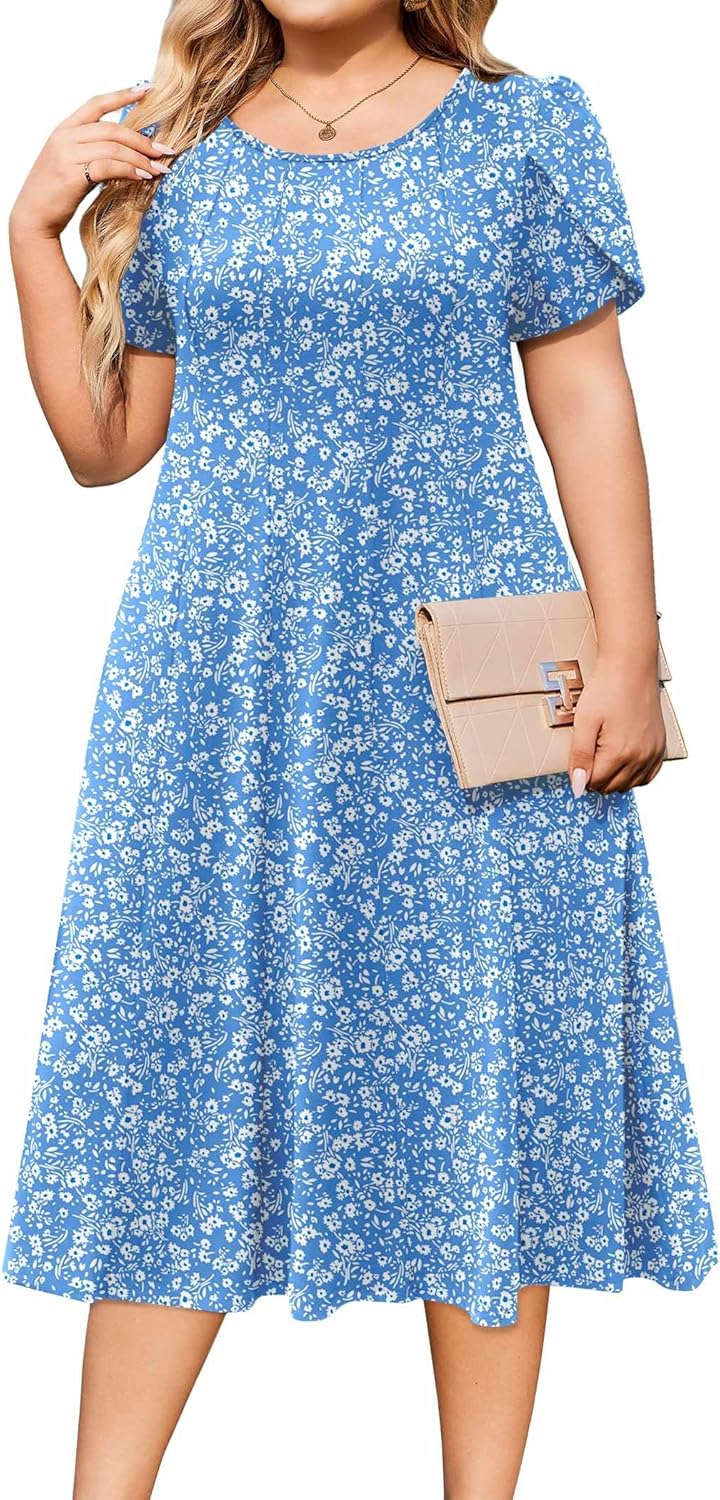 IN'VOLAND Women Plus Size Summer Dresses Petal Short Sleeve Casual Loose Flowy A Line Midi Dress Boho Sundress with Pockets