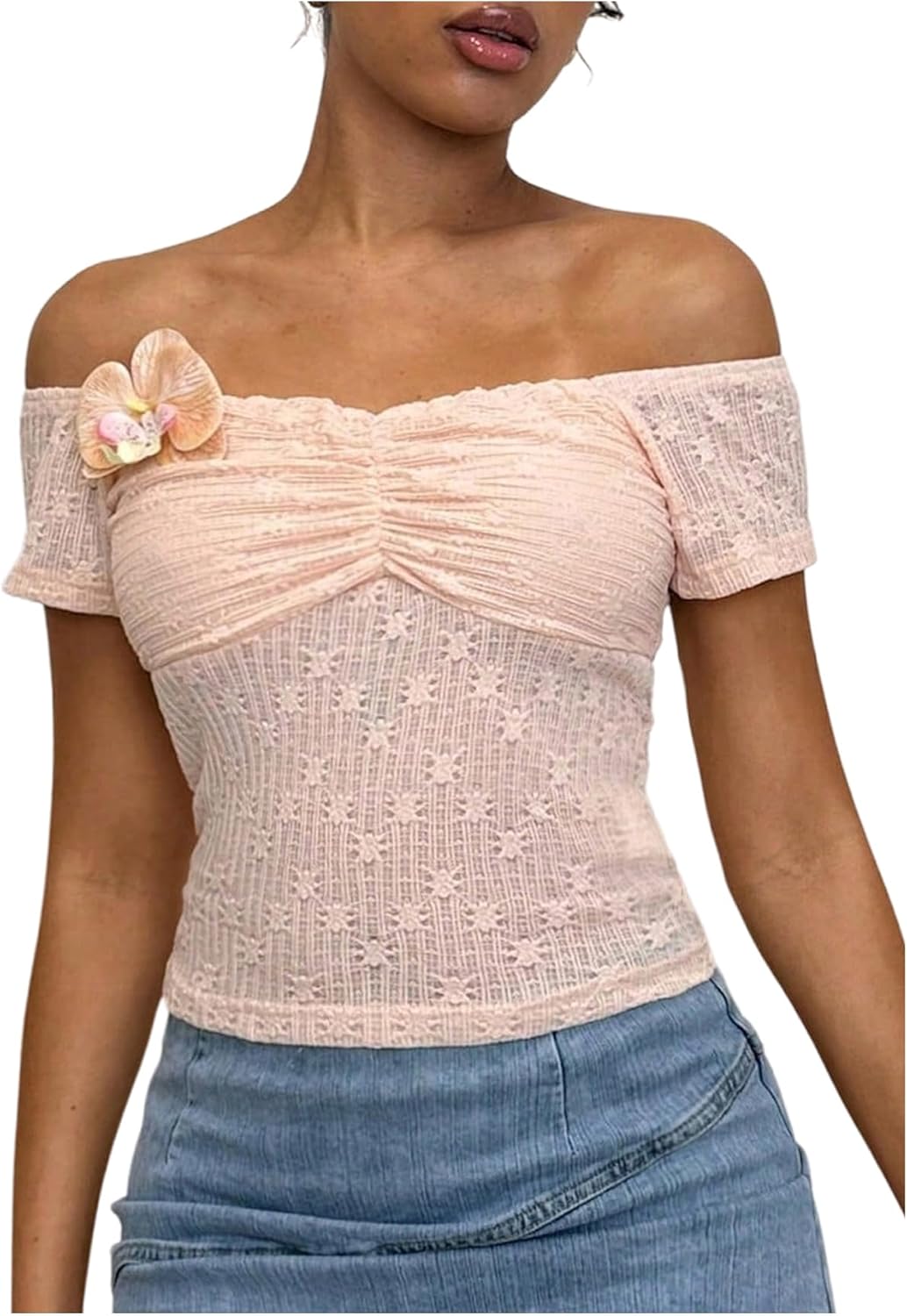 OYOANGLE Women's 3D Floral Off The Shoulder Top Ruched Short Sleeve Sheer T Shirts