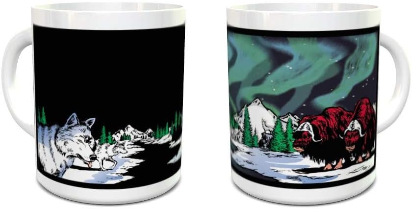 - When the mug is cold, the mug shows an image of Wolves and musk ox facing off on the Alaskan tundra at night. Add a hot beverage to see more wolves as the Northern Lights appear overhead.