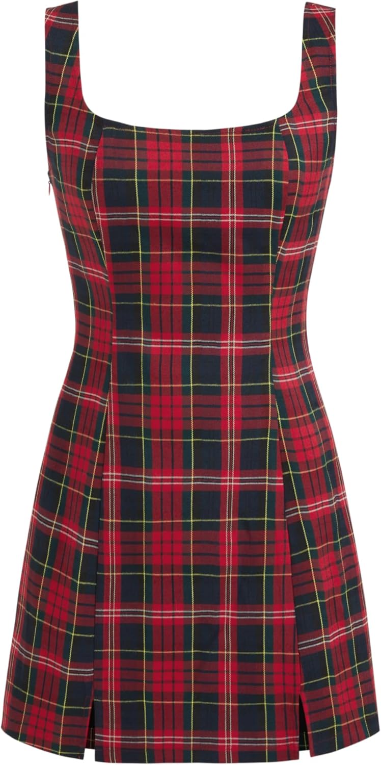 CIDER Mini Dress Plaid Checks Sleeveless Short Party Dress Scoop Neck Middle Waist Zipper Casual