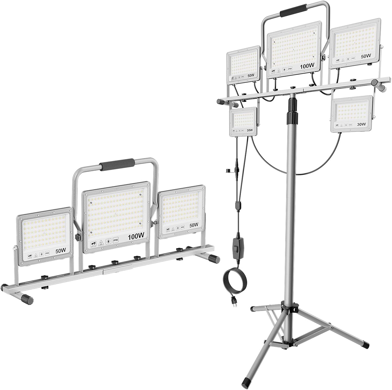 - Super Bright LED Work Lights:260W LED tripod work light delivers intense illumination through five integrated lamp heads (30W x2, 50W x2, 100W x1), producing a concentrated 6500K natural white beam. With an impressive total output of 31,000 lumens, it replaces traditional halogen lights with much higher brightness and significantly lower power consumption. Whether you're working on automotive repairs, interior remodeling, or night construction, this setup ensures wide and stable coverage to boost safety and work efficiency.