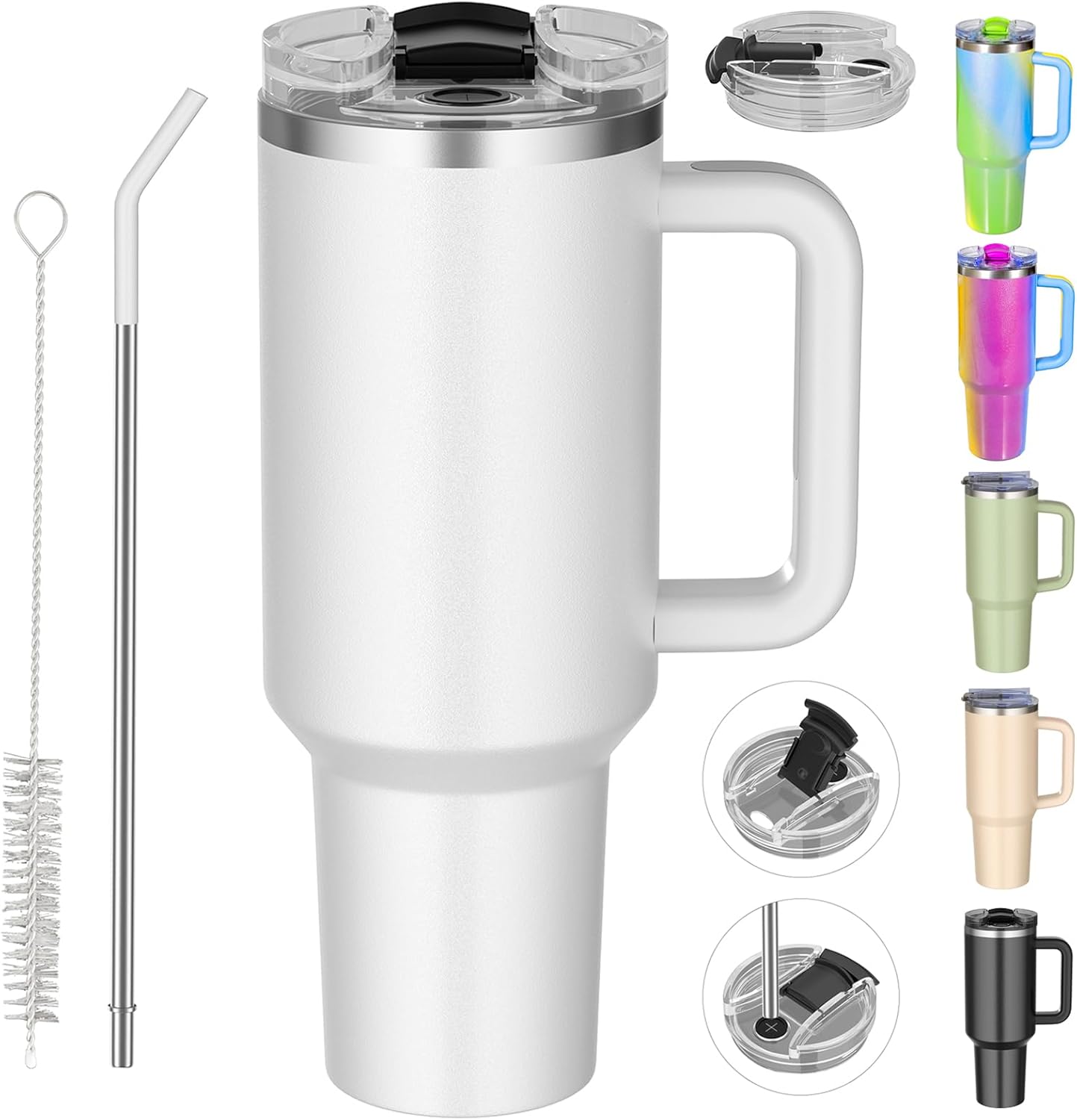 40 oz tumbler with handle and straw,Double Wall Vacuum Reusable Stainless Steel Insulated Water Bottle,With Leak Proof lid and Straw for Iced or Cold Beverages (White)