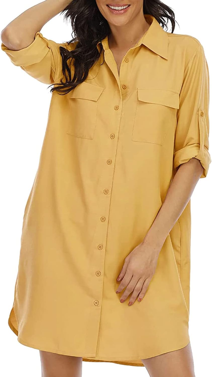 LUSMAY Women's Long Sleeve V Neck Button Down Shirt Dresses Casual Summer Dress with Pocket