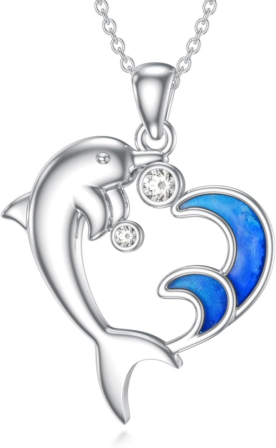 Diamond Dolphin Necklace for Women 925 Sterling Silver Dolphin and Wave Heart Pendant Necklace Summer Ocean Jewelry Gifts for Women Mom Wife Girlfriend Daughter Her