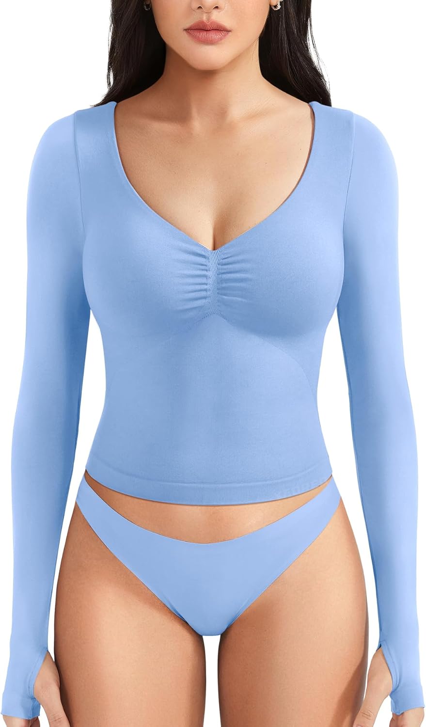 YEOREO Long Sleeve Workout Tops for Women Padded Deep V Neck Double Lined Impact Tops Agniee Slim Fit Gym Athletic Shirts