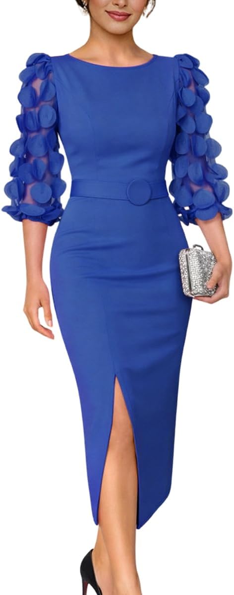 Womens Bodycon Midi Dress Elegant Polka Dot Mesh Puff Sleeve Slit Office Formal Cocktail Wedding Party Dresses with Belt