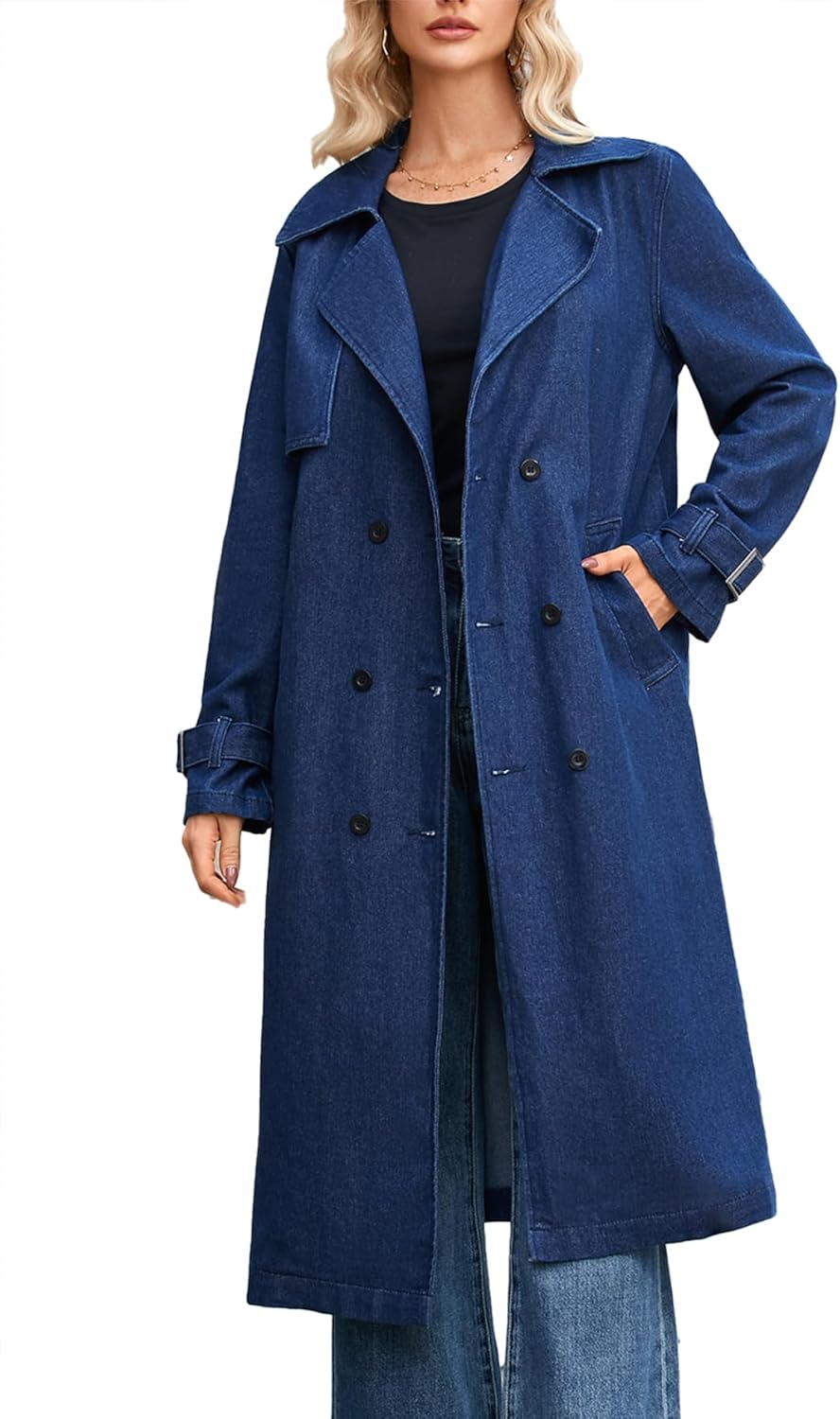Ladyful Long Denim Jacket Trench Coat Double Breasted Lapel Jean Jacket Oversized Windproof Overcoat