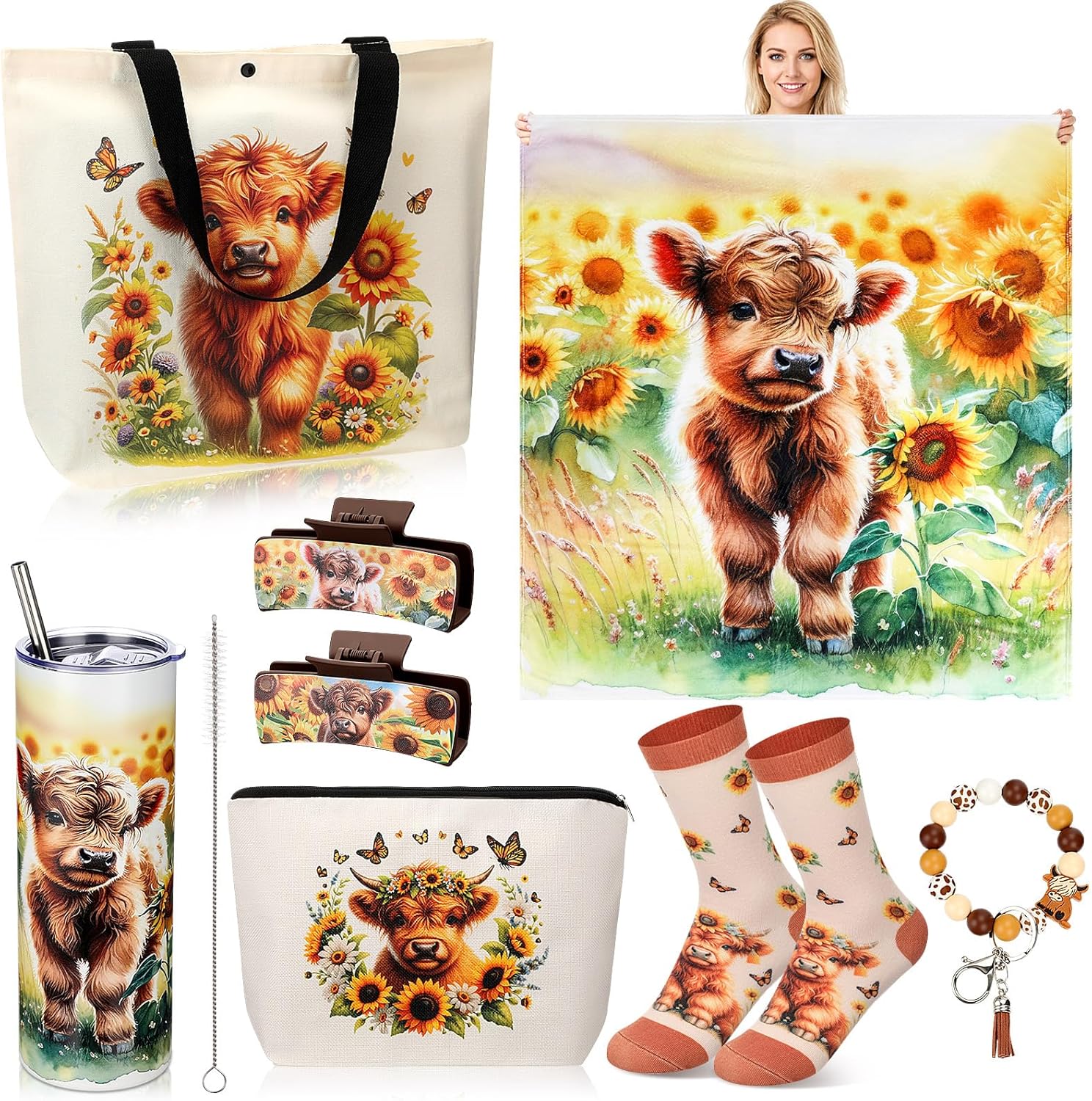 8 Pcs Highland Cow Gifts for Women Sunflower Highland Cow Lover Stuff with Tumbler Blanket Canvas Tote Bag Makeup Bag Socks Keychain Hair Claw Gift for Women Mom Sister Coworker Friend