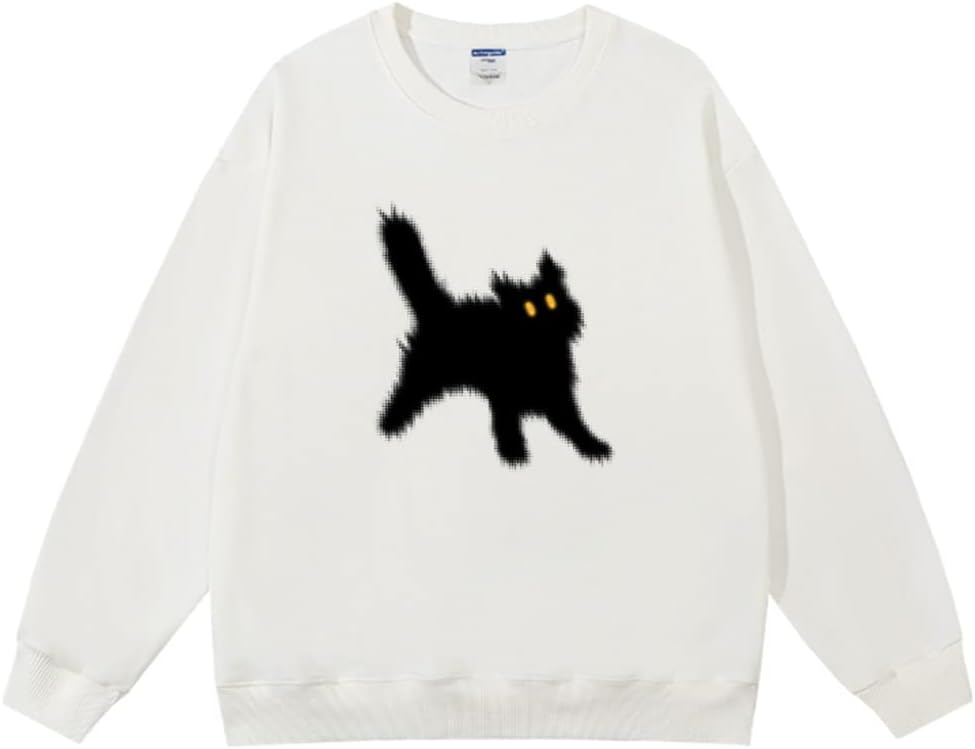 Women's Crewneck Sweatshirts Oversized Casual Long Sleeve Cotton Fall Tops Cute Cat Pattern Pullover Sweatshirt