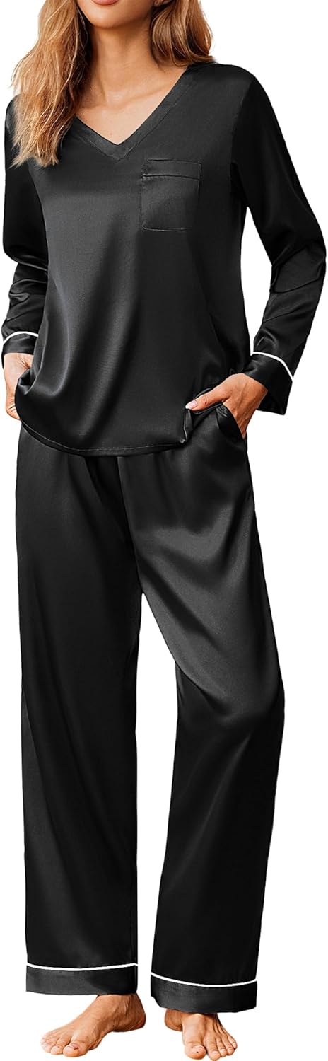 Ekouaer Satin Pajama Set for Women Soft Silk Sleepwear Long Sleeve V Neck Loungewear 2 Piece Pj Sets