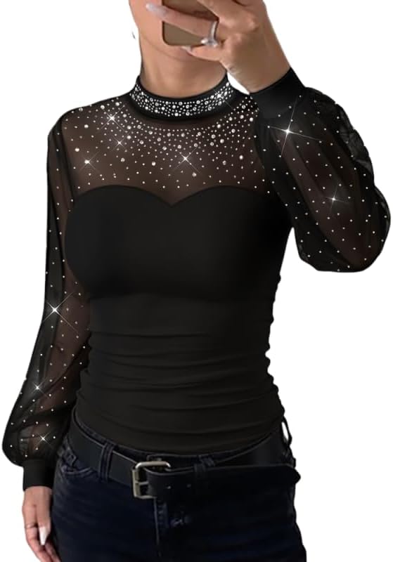 Women Rhinestone Top Mock Neck Lantern Long Sleeve Shirt Sheer Mesh Spliced Tee Hollow-Out Back Slim Fit Top
