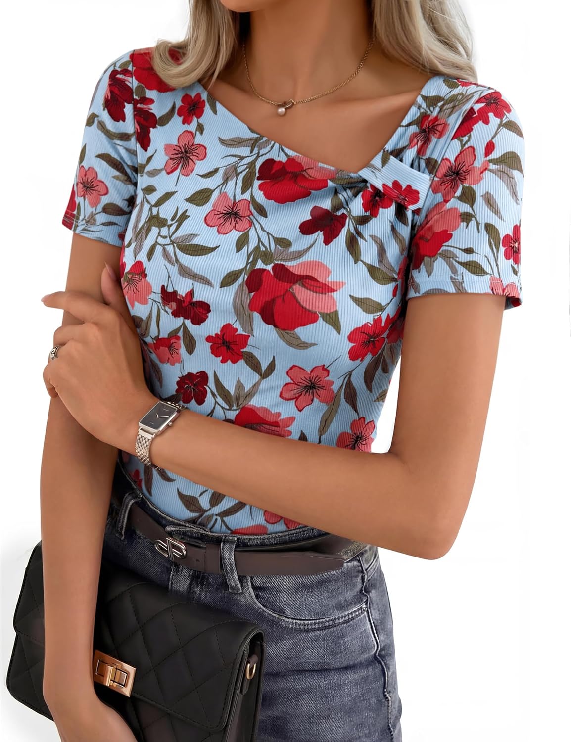ZESICA Women’s Spring Asymmetrical Short Sleeve Tops 2026 Summer Ruched Fitted Going Out Shirts Fashion Vacation Clothes