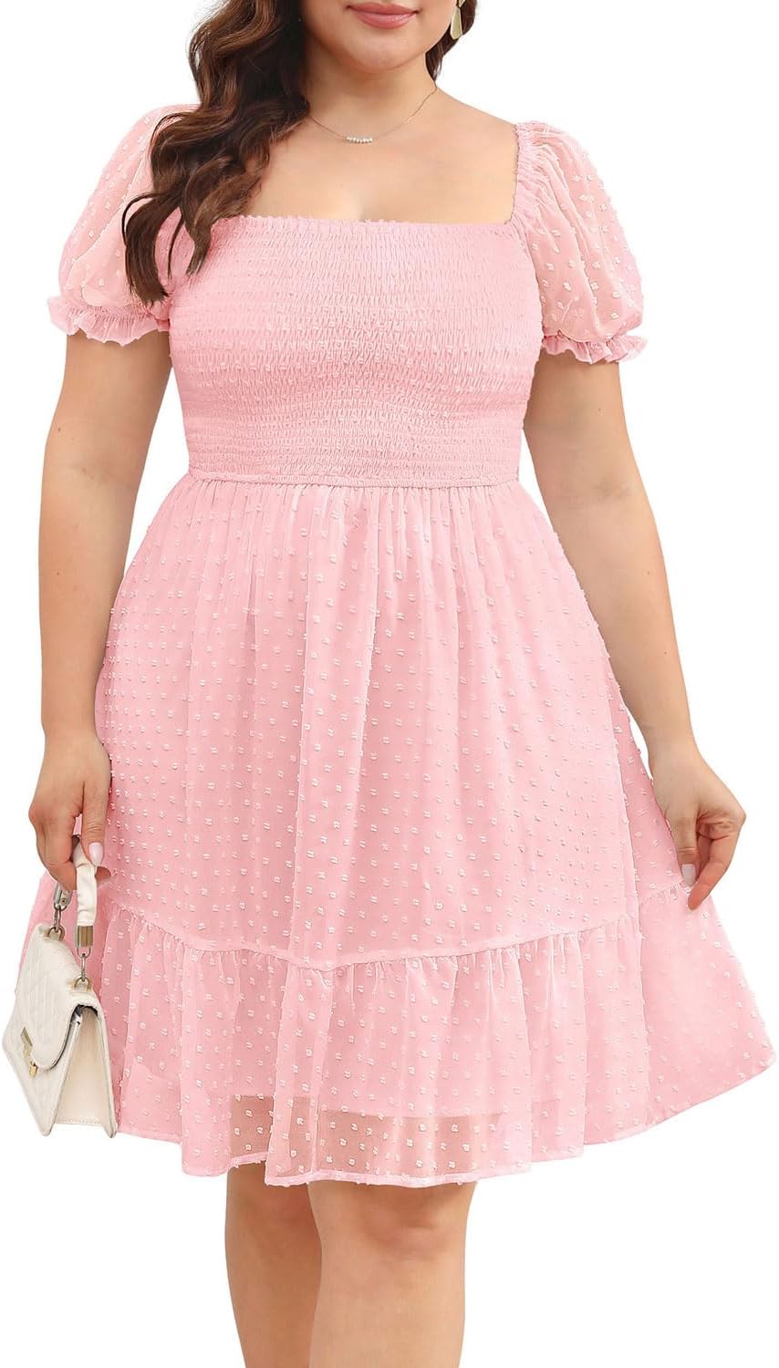 Women Plus Size Square Neck Puff Sleeve Babydoll Summer Chiffon Swiss Dot Flowy Short Smocked Dress