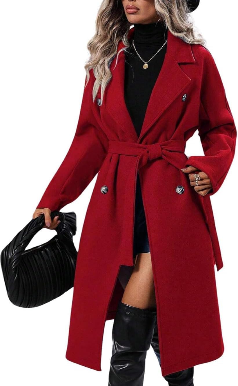 Ru Sweet Womens Winter Notched Lapel Trench Coat Long Wool Double Breasted Pea Coat with Belt