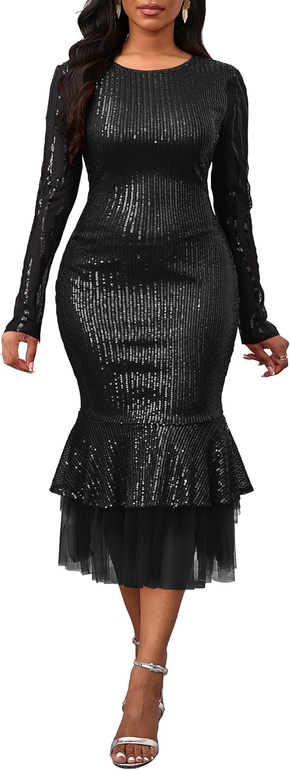 VERWIN Sequins Dress Long Sleeve Bodycon Dress Ruffle Mesh Hem Maxi Dress Mermaid Sparkly Round Neck Prom Dress