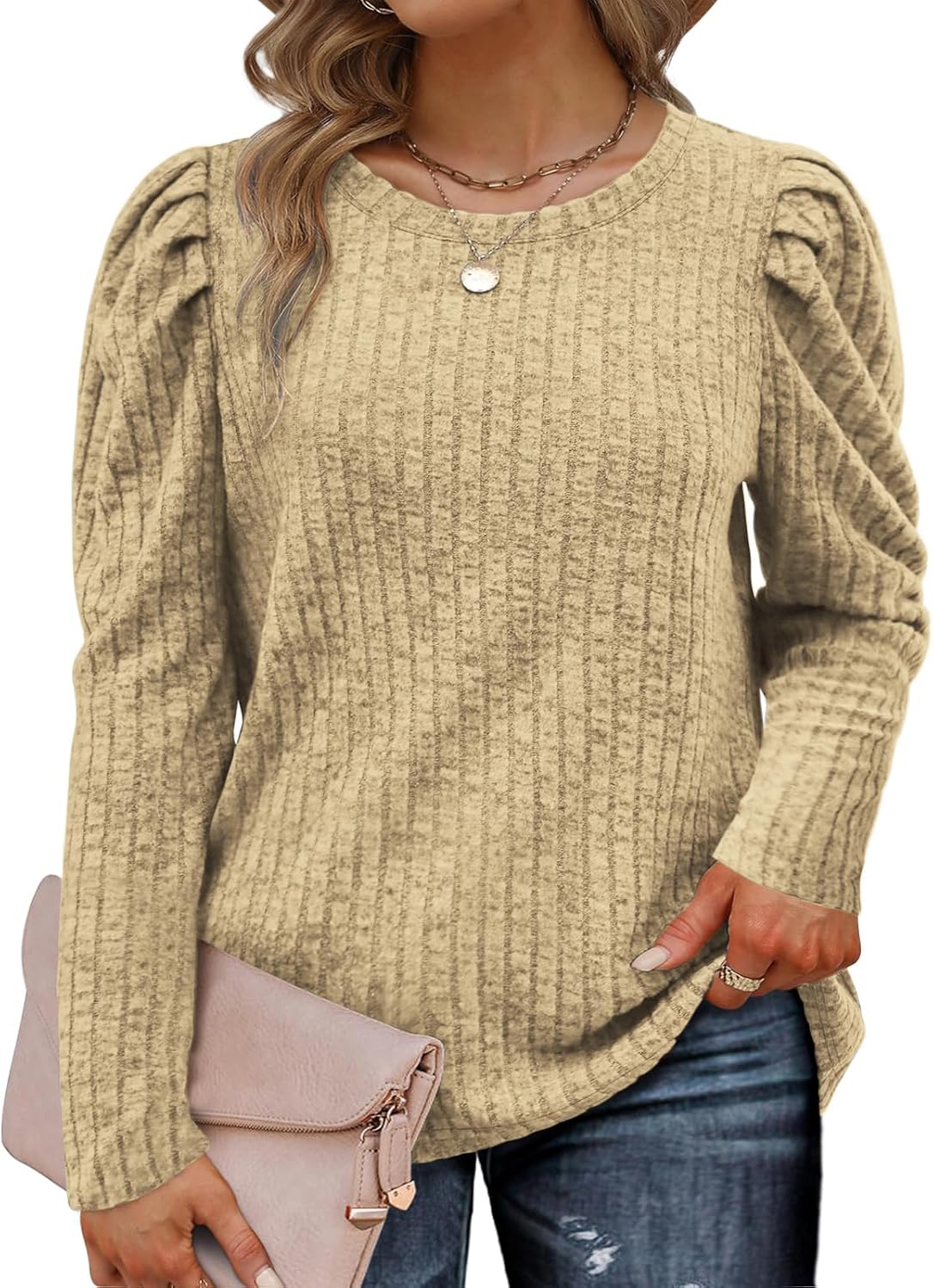 ROSRISS Womens Plus-Size Tops Crewneck Puff Long Sleeve Shirts Dressy Ribbed Knit Tunics Elegant Pullover Sweaters XL-5XL
