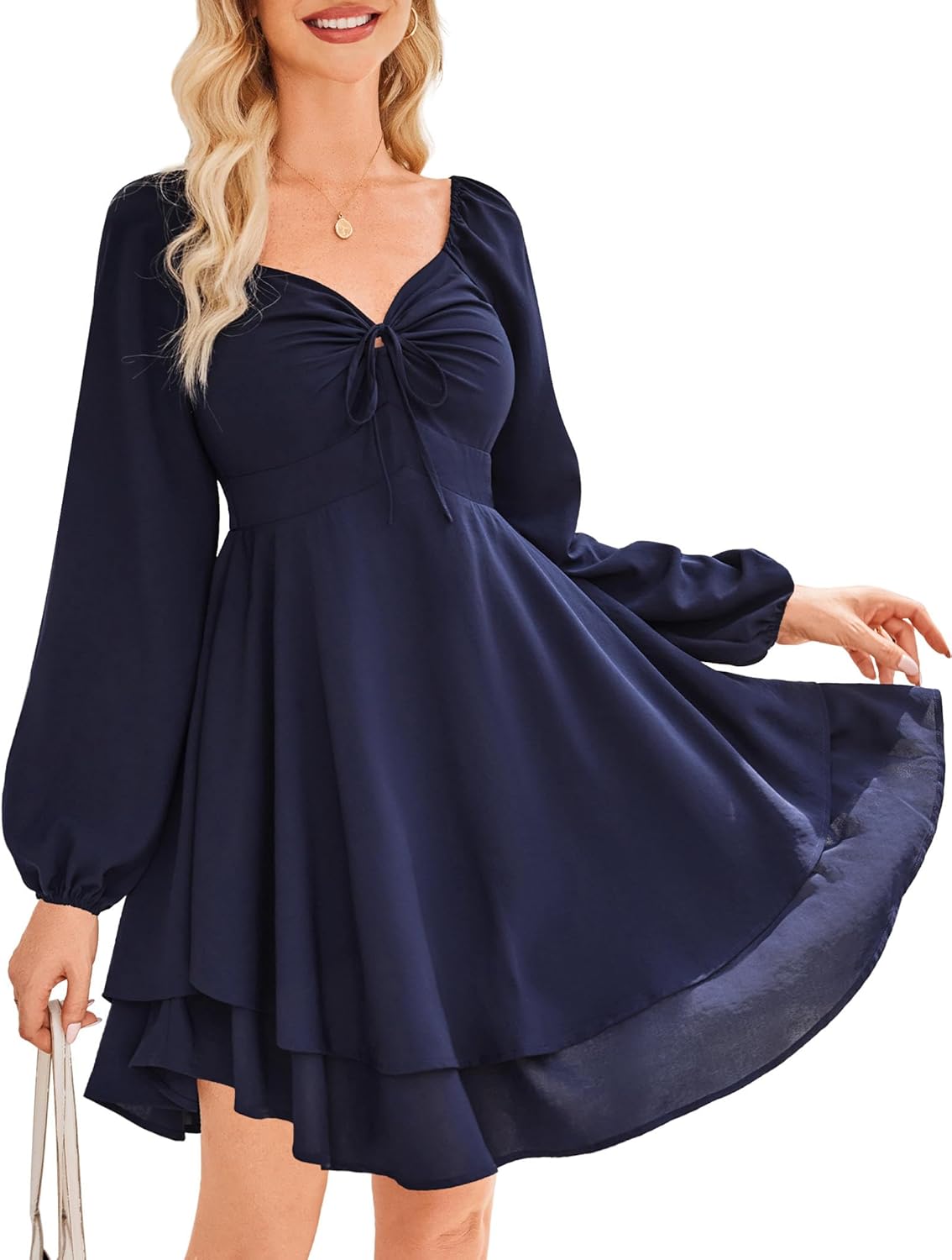 Florboom Women's Lantern Long Sleeve Dress Layered Mini Dresses with Adjustable Ruched Bust, Tie Waist