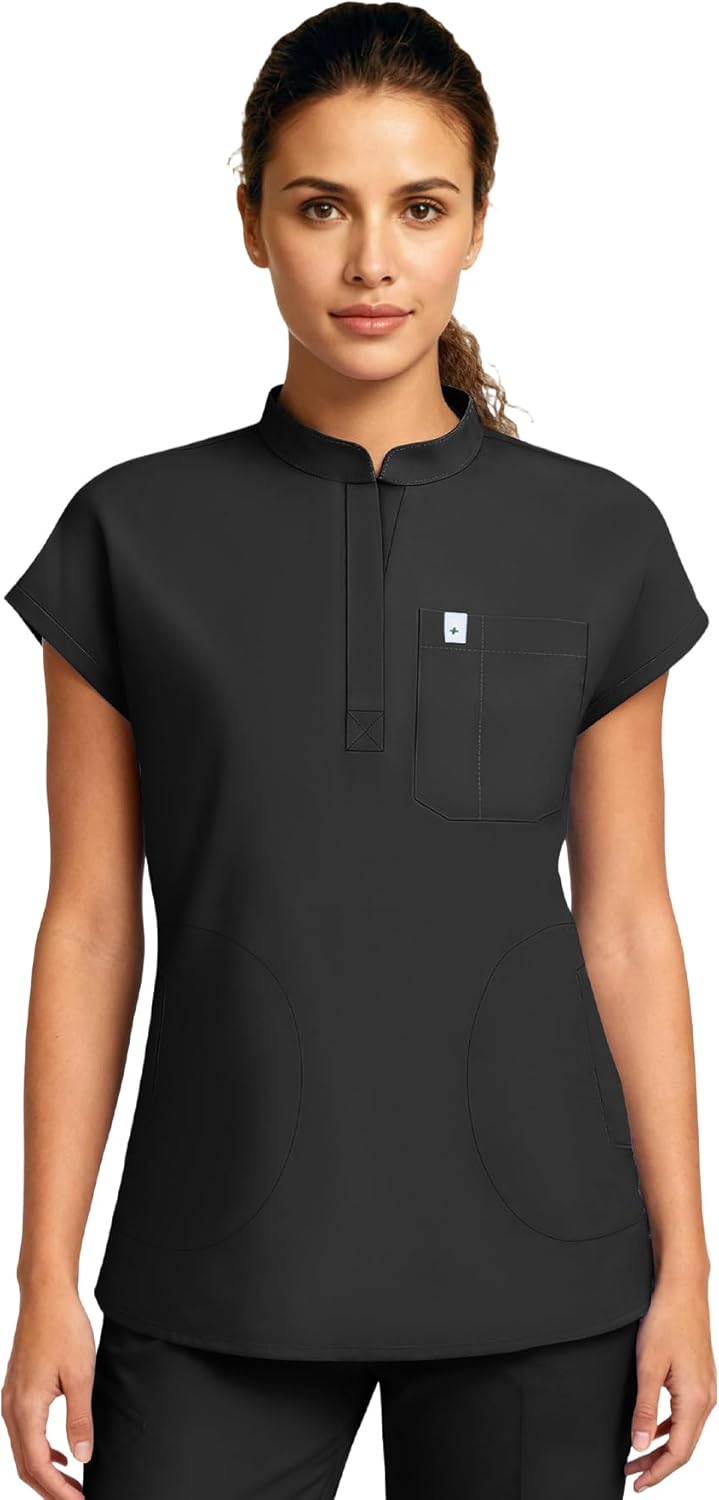 Medical Scrub Tops for Women - Mandarin Collar, Relaxed Fit, 4-Pocket Design, Shirttail Hem, Soft Stretch Scrub Shirts