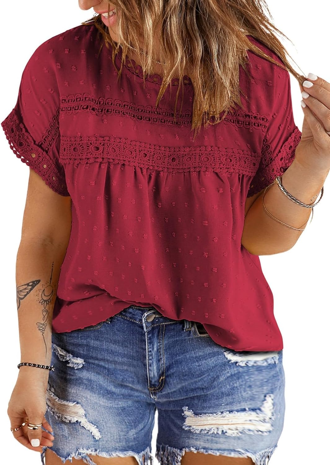 Eytino Womens Plus Size Tops Summer Crewneck Short Sleeve Lace Crochet Loose Casual Chiffon Blouses Shirts,3X Red Dahlia