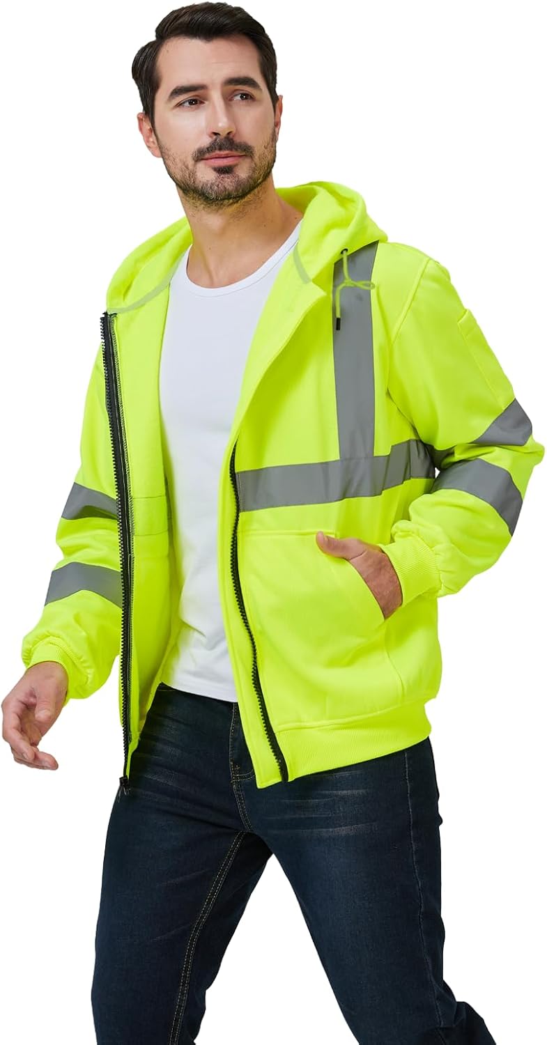 High Visibility Safety Hoodie, Reflective Workwear Sweatshirt, Warm Breathable Work Jacket for Men, Zip-Up