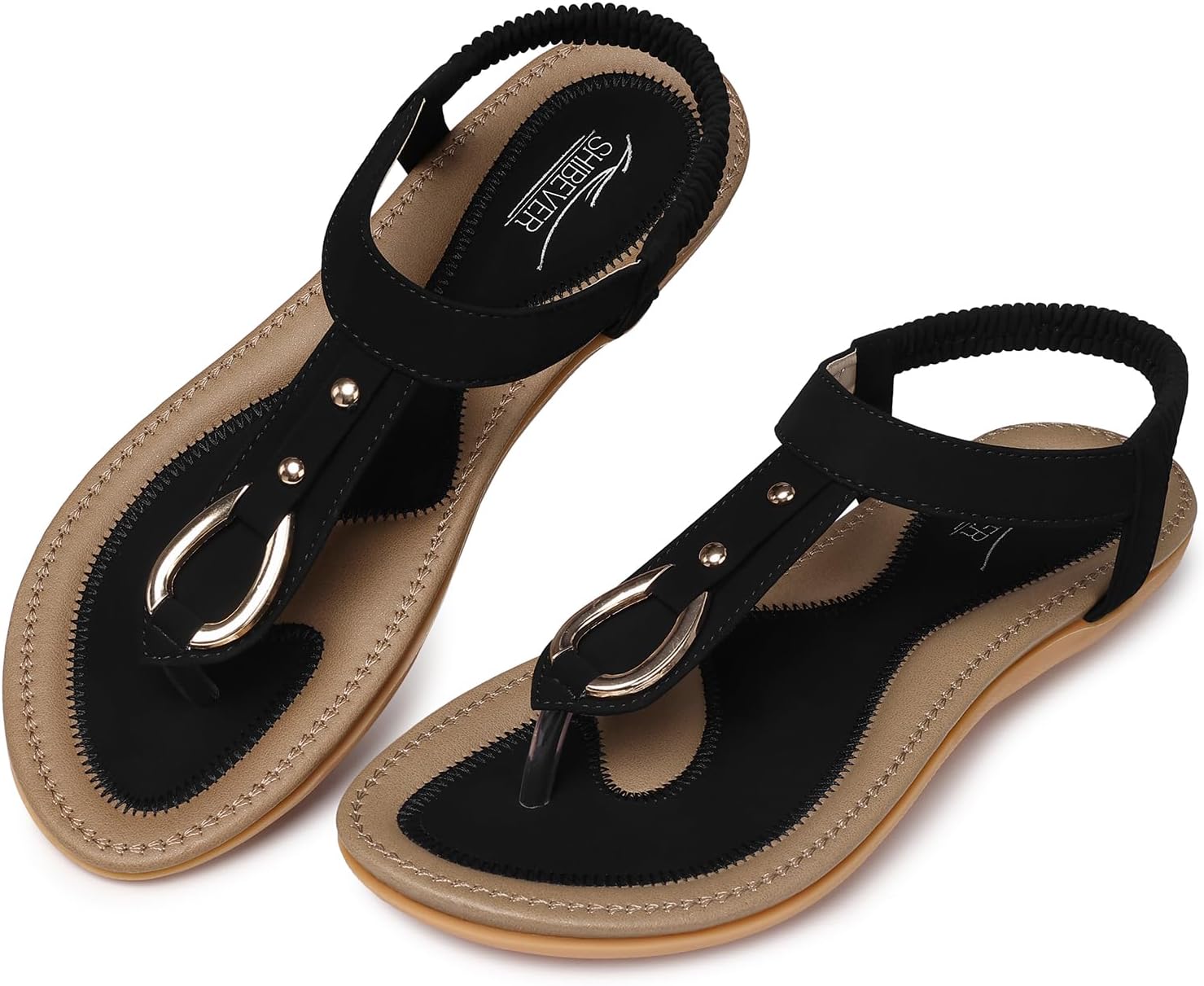 SHIBEVER Sandals Women Dressy Flat: Summer Casual Arch Support Thong Flats - Comfortable Walking Beach Sandals - Black Size 7 Elastic Ankle Strap Sandal