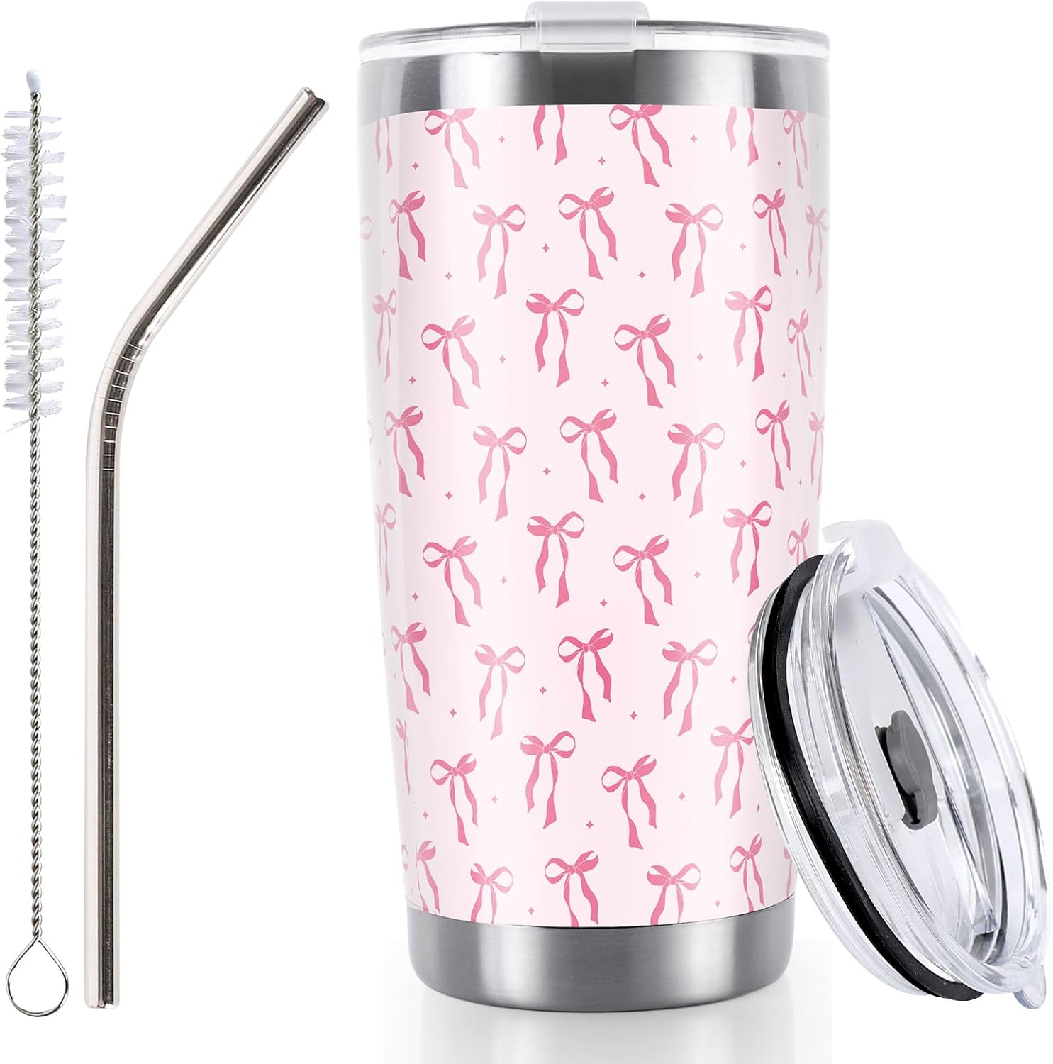 Whaline Pink Bow Tumbler Stainless Steel Travel Tumbler with Lid Straw Brush Coquette Bowknot Coffee Mug Cup for Women Friend Holiday Birthday Party Favors