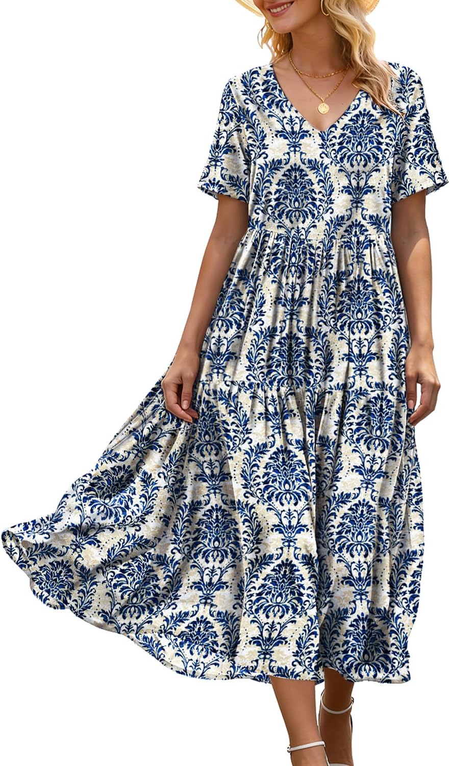 YESNO Women's Summer Maxi Dresses Casual Floral Short Sleeve V Neck Boho Beach Vacation Swing Dress with Pockets EVF