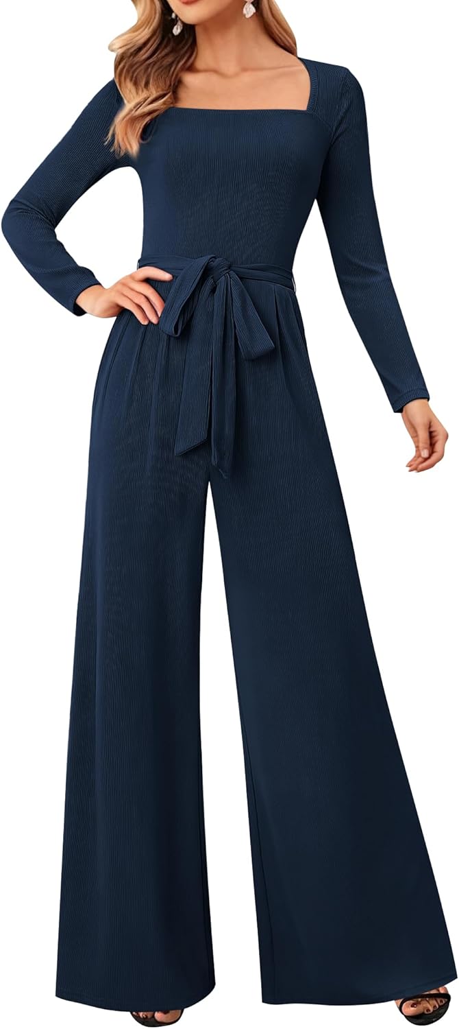 Jumpsuits For Women Dressy Long Sleeve Square Neck Casual Belted Wide Leg Long Pants Romper One Piece Outfits