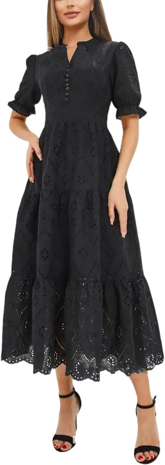 utcoco Womens Eyelet Lace Embroidered Dress Elegant V Neck Short Puff Sleeve Tiered A Line Midi Dresses