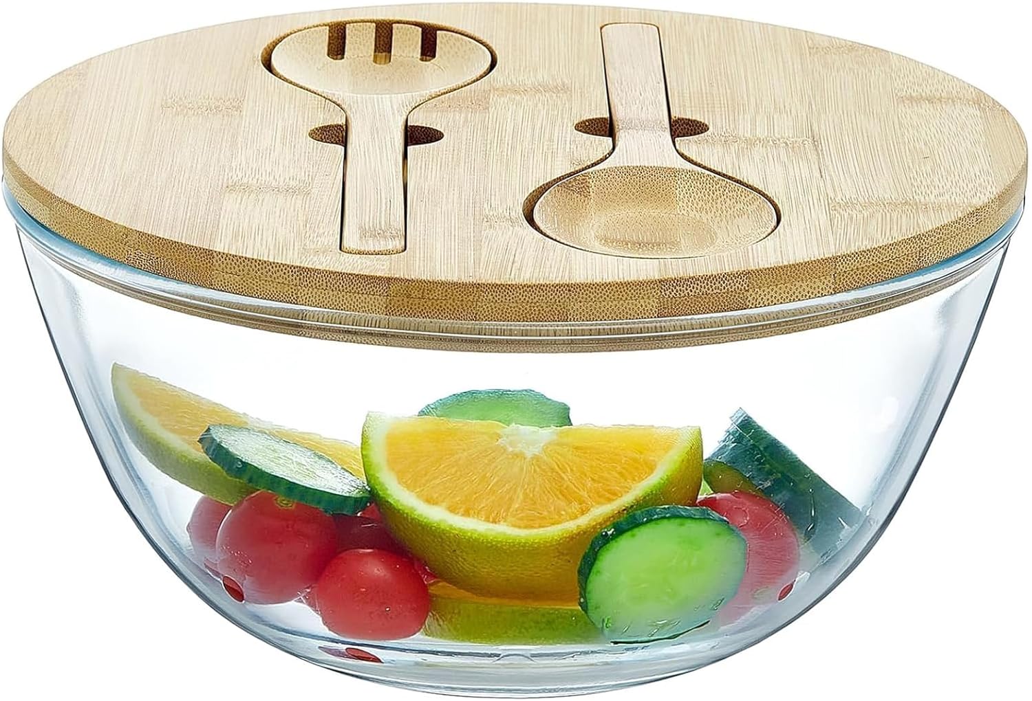 - Unique Design of Salad Bowl with Bamboo Wooden Lid --This glass salad bowl features a unique lid and salad servers design, ensuring a one-of-a-kind look that stands out in your kitchen. -----NOTE----The bamboo lid is strong and sturdy, with a thickness, not easy to deform or warp, can be used to store salads well. Our lids of glass salad bowl can be used as cutting board in a pinch. The innovative bamboo lid with built-in utensil slots combines functionality with elegance.