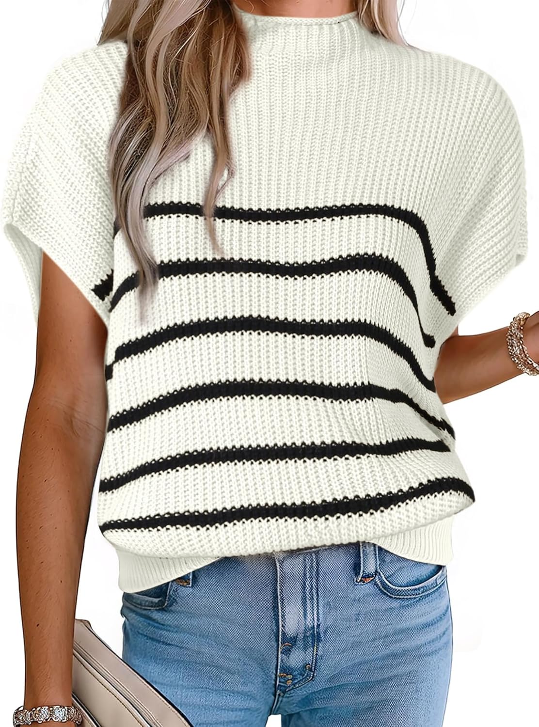 Allegra K Women's Mock Neck Striped Sweater Vest Casual Cap Sleeve Knit Pullover Tops