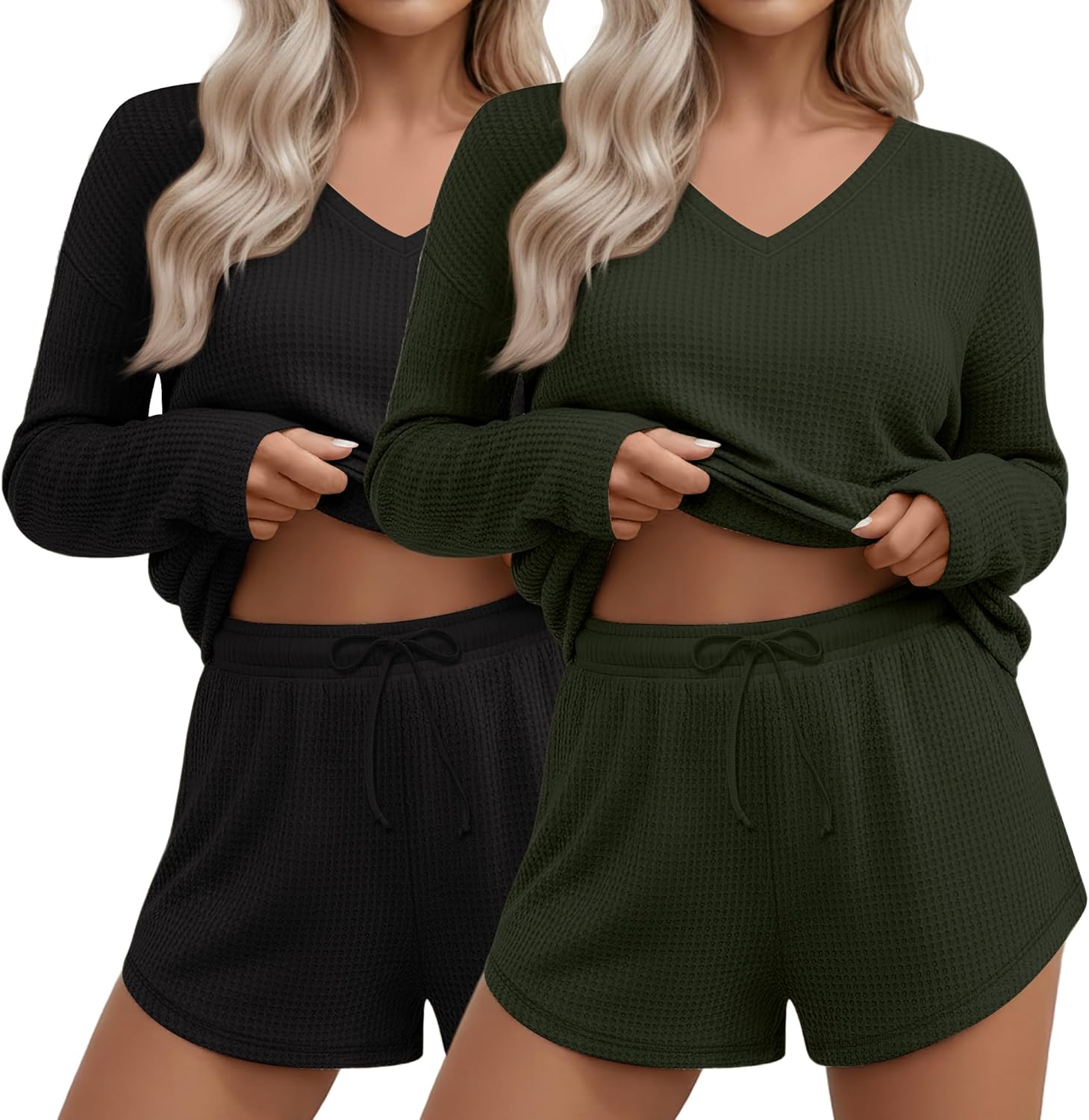2 Pack Women's Waffle Knit Lounge Sets Long Sleeve V Neck Pajama Sets Tops and Shorts Loungewear with Pockets