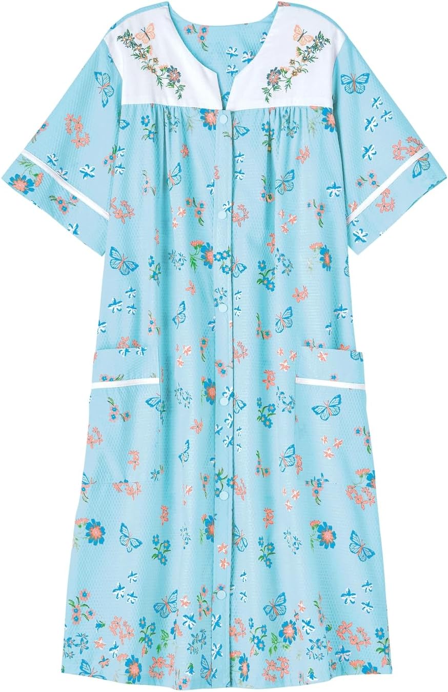 AmeriMark Women Calf-Length Snap Front Knit Duster House Coat Robe – Loose-Fitting Plush Bathrobe - Short Sleeve Bath Robe