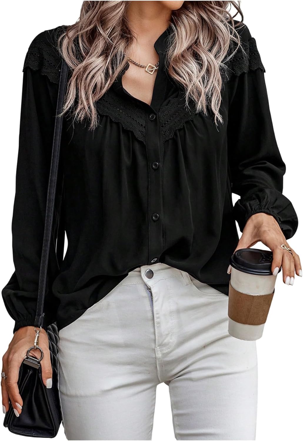 SHENHE Women's Casual Lace V Neck Tops Dressy Button Down Eyelet Long Sleeve Blouses Office Business Work Outfits 2025