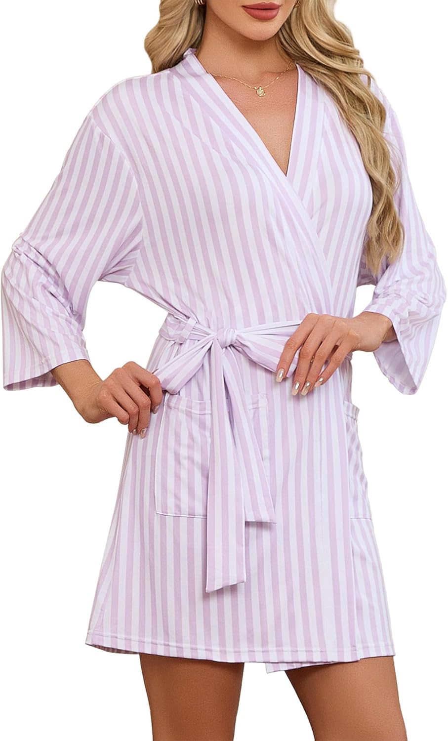 LYCY Robes for Women Striped Short Bathrobe, Soft Lightweight Kimono Robe with Pockets