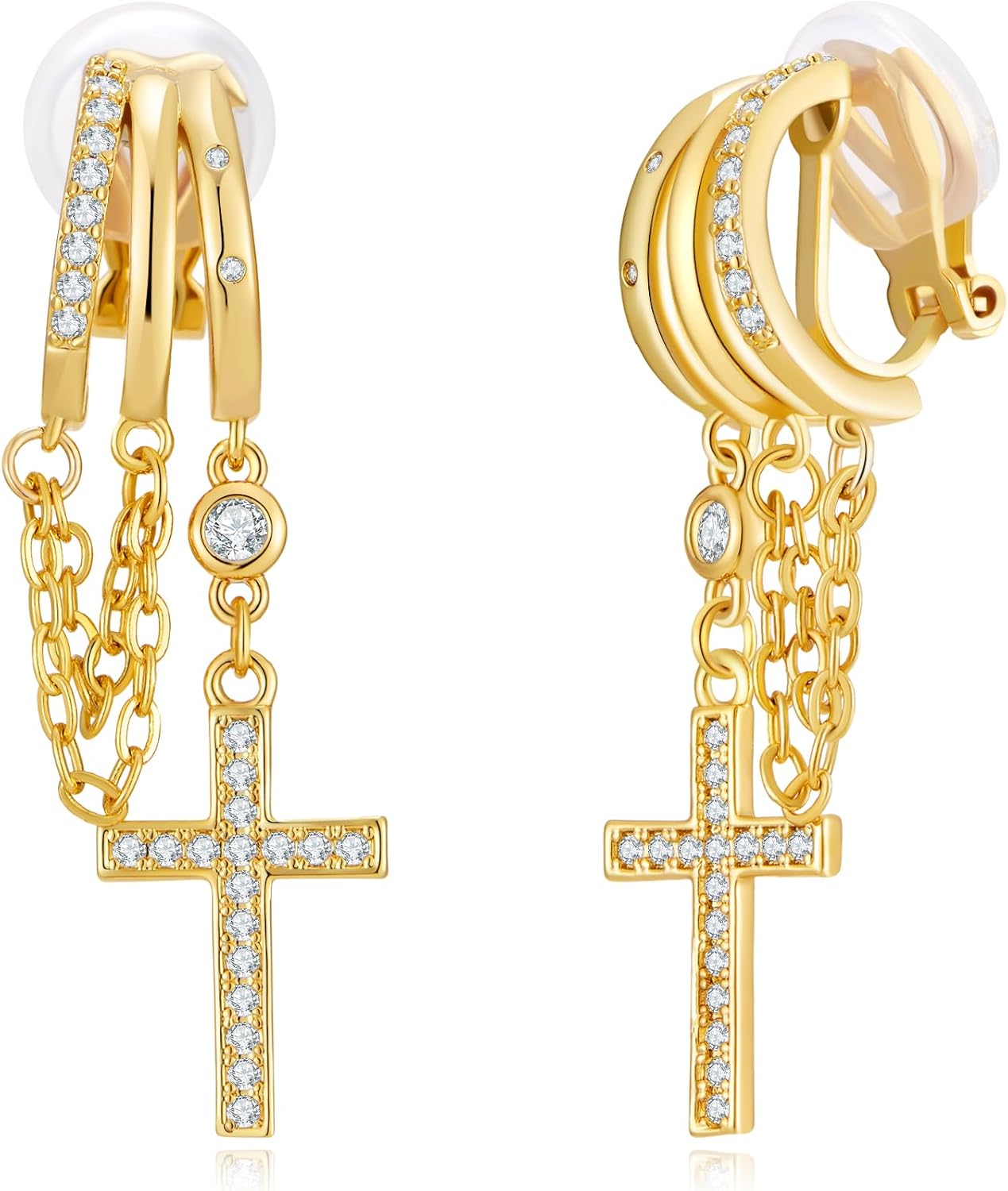 14K Gold Plated Crystal Cross Clip On Earrings for Women - Non Piercing Triple Huggie Dangle Chain Hoops Earrings, Punk Chunky Christianity Statement Cross Earrings