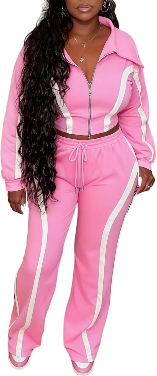 Women Striped 2 Piece Outfits Long Sleeve Zip Up Jacket Top and Wide Leg Pants Set Tracksuits with Pocket