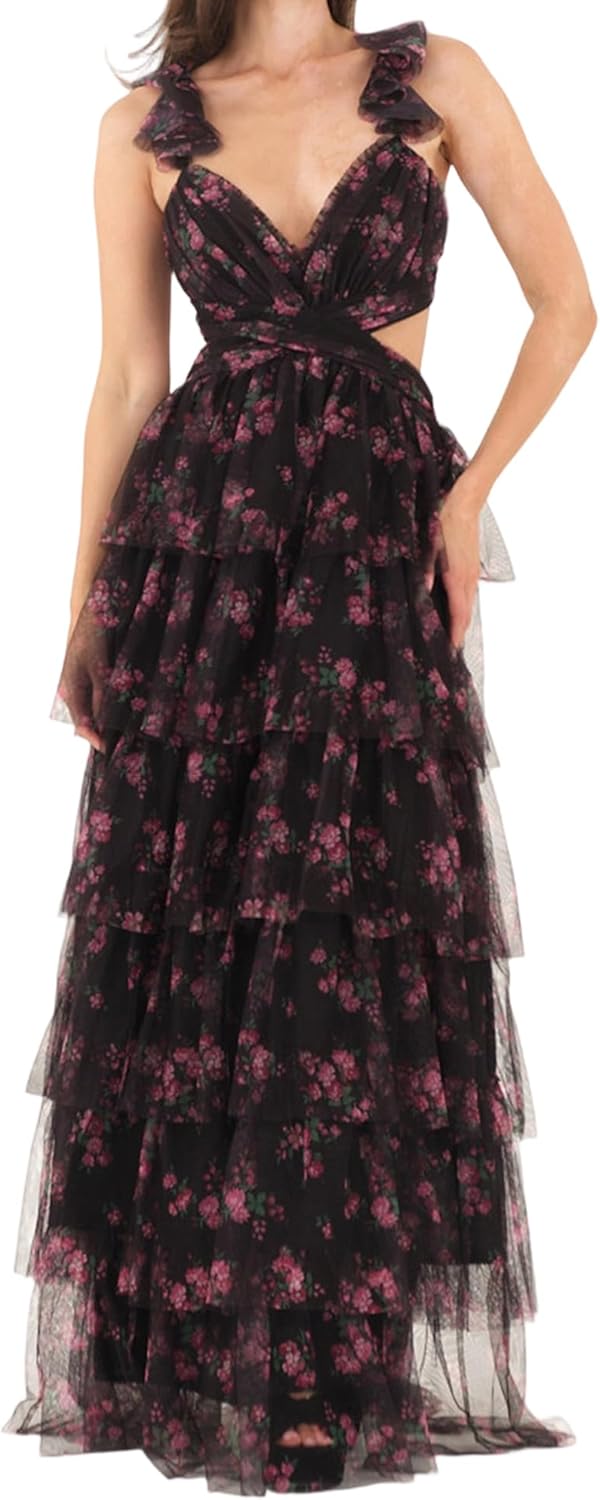 Women Ruffle Tiered Maxi Dress Y2K Sleeveless Layered Flowy Dress Boho Floral Swing Long Dresses