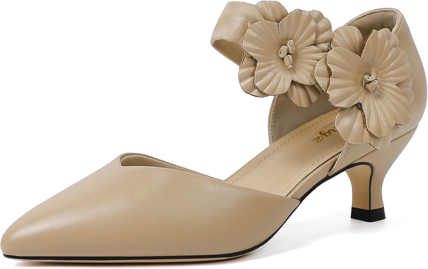 RIBONGZ Black Kitten Heels for Women Low Closed Toe Dressy Pumps Comfortable Slip On Flower Dress Shoes for Wedding Dancing Party Office Work