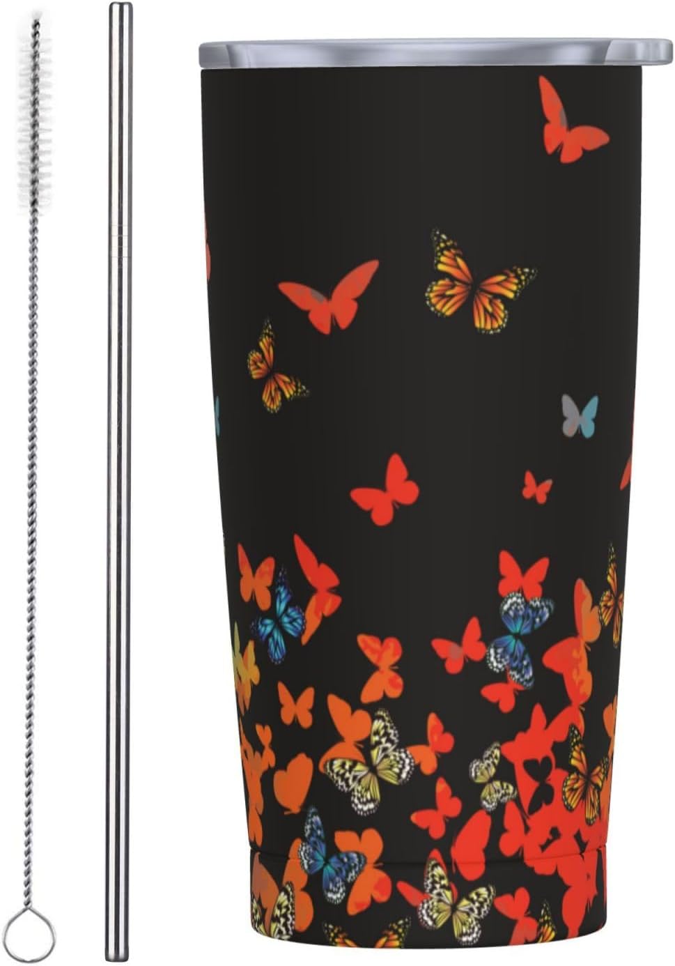Colored Butterflies Tumbler,Butterflies 20oz Stainless Steel Insulated Travel Tumblers,Travel Coffee Mug with Lid and Straw Water Bottle Drink Tumbler Cups Gifts for Women Men