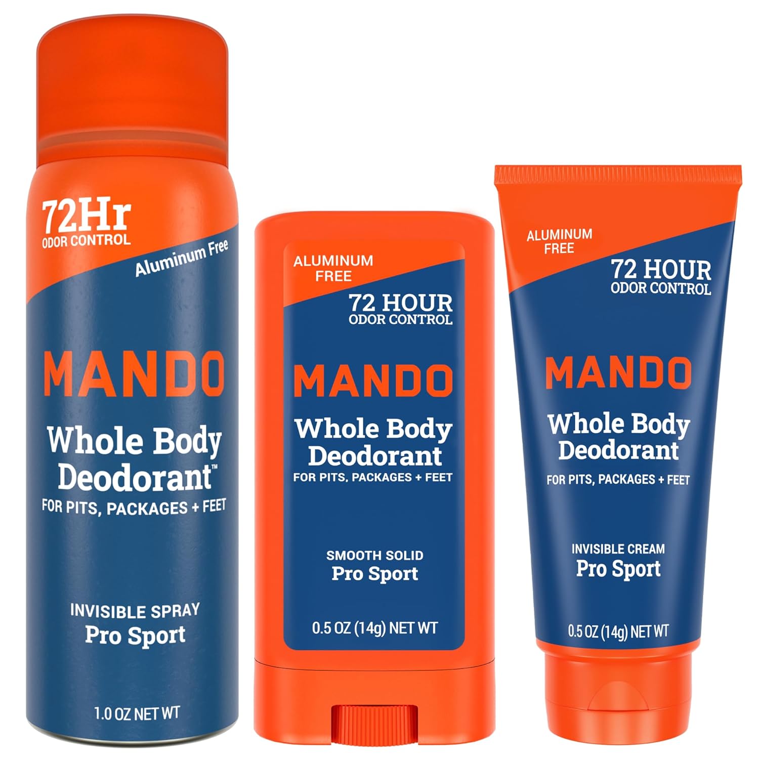 Mando Whole Body Deodorant Mini Trio – Solid Stick, Invisible Cream & Spray – 72HR Odor Control – Aluminum & Baking Soda Free, Skin Safe, Travel Size for Men – Pro Sport Scent