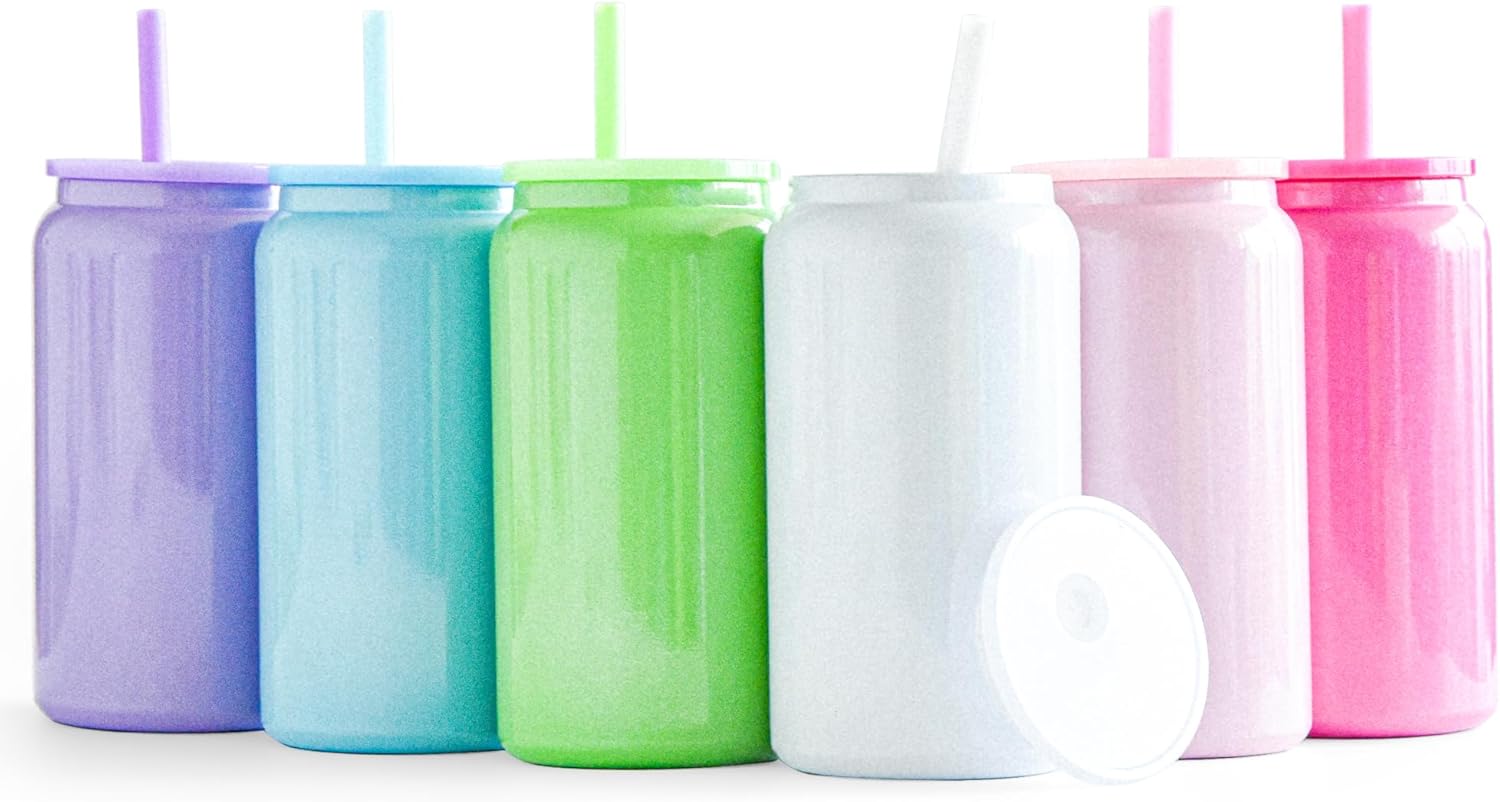 6 Pack Glass Cups with Lids and Straws Unbreakable 16 oz Stainless Steel Can Cup Double Wall Insulated Beer Can Tumbler for Iced Coffee, Juice, Soda, Iridescent-Colored