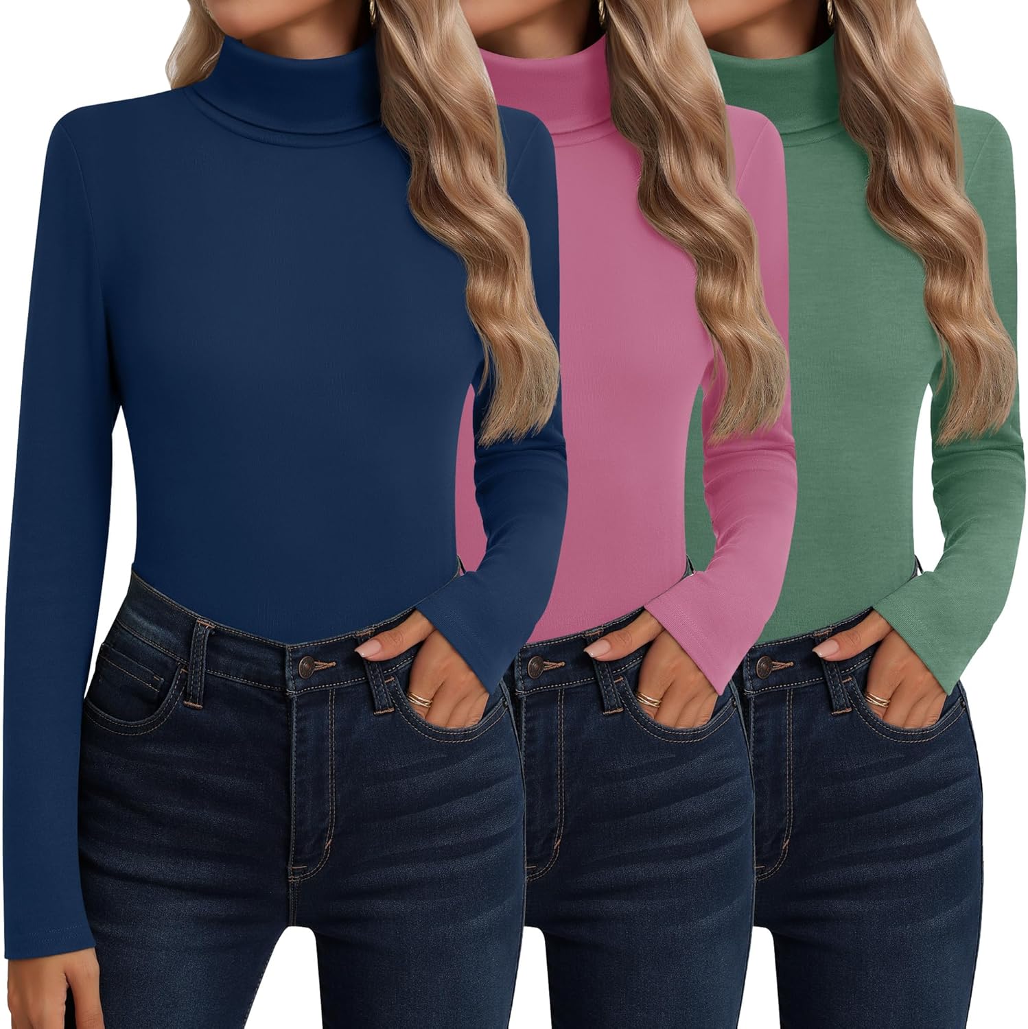 Ekouaer Women 3 Pack Turtleneck Shirts Ribbed Thermal Underwear Tops Lightweight Long Sleeve Layer Tees Basic Pullover Blouse