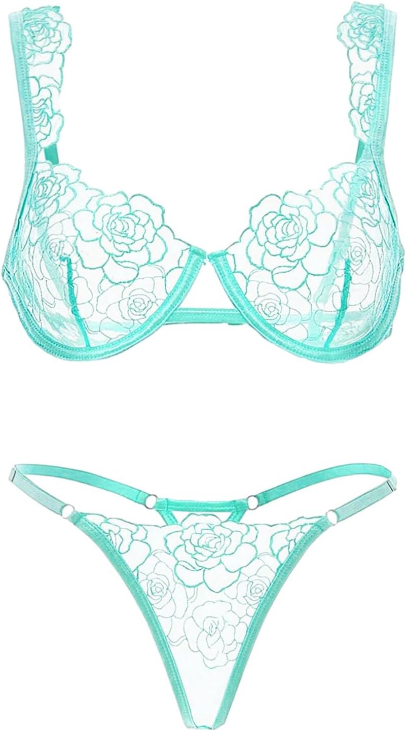 Lilosy Women Sexy Floral Embroidered Mesh Sheer Underwire Push Up Lingerie Set